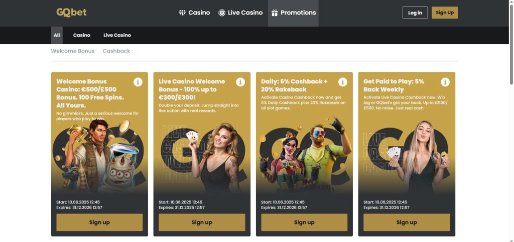 GQbet Casino provides a selection of promotions designed to give players more value and motivation to play regularly. Below is an overview of each active offer available at GQbet.