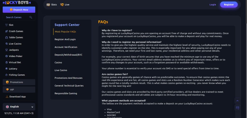 Lucky Boys Casino provides resources to help players avoid compulsive behaviour. Staff receive training to recognise risky patterns. Self-exclusion options are available for players who need a break, ranging from one day to five years. During this period, accounts are blocked and cannot be reopened until the exclusion ends.
