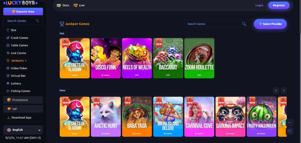 The desktop version of Lucky Boys Casino is arranged to give players fast access to all functions. At the top right corner, you will find the Log In and Register buttons, which are always visible for convenience.