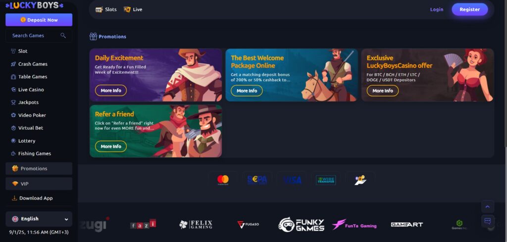 Lucky Boys Casino gives players a wide range of promotions that cover both new and loyal members. While the site does not provide free spins no deposit no GamStop bonuses, it compensates with clear deposit-based promotions that are easy to claim and use.