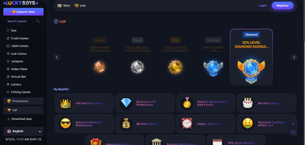 Yes, Lucky Boys Casino has a tiered VIP Club with levels ranging from Bronze to Diamond. Benefits include cashback, exclusive promotions, faster withdrawals, and special gifts.