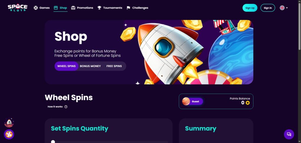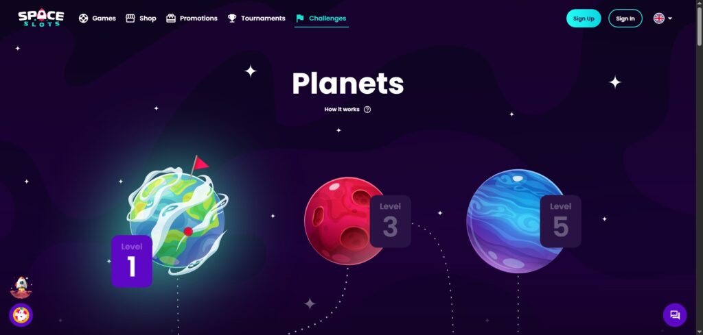 SpaceSlots Casino offers a five-level challenge system that ties into its cosmic theme. Each level tasks you with missions that award cosmic items and Loyalty Points. Complete a full set of items to move on to the next planet. Once you collect enough points, redeem them in the Shop for free spins or bonus cash.
