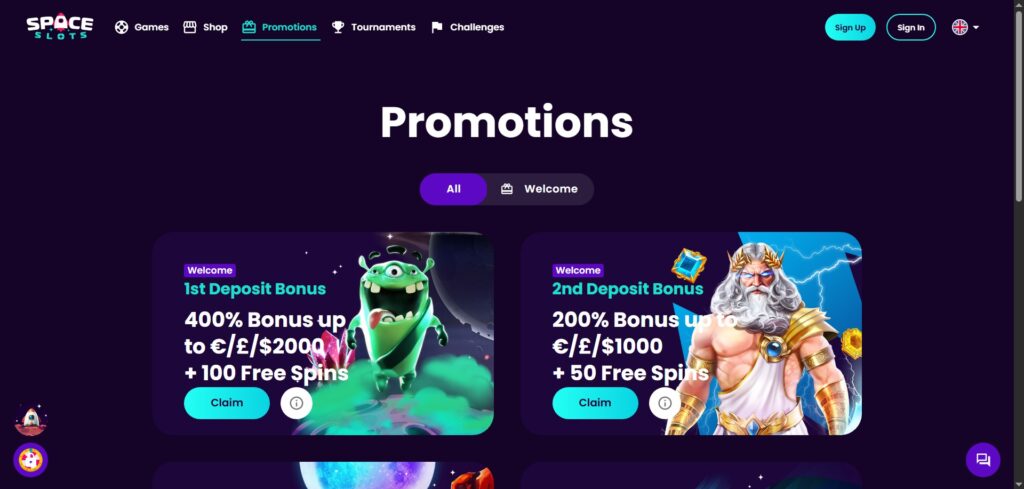 SpaceSlots Casino greets new players with five tiered deposit offers that boost your bankroll and spin count. There are no free spins no deposit no GamStop bonuses, but new players receive a variety of deposit match rewards and free spins: