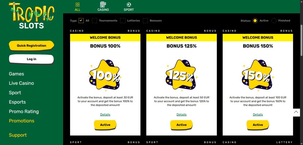 Welcome Bonus and Other Offers in Tropic Slots Casino